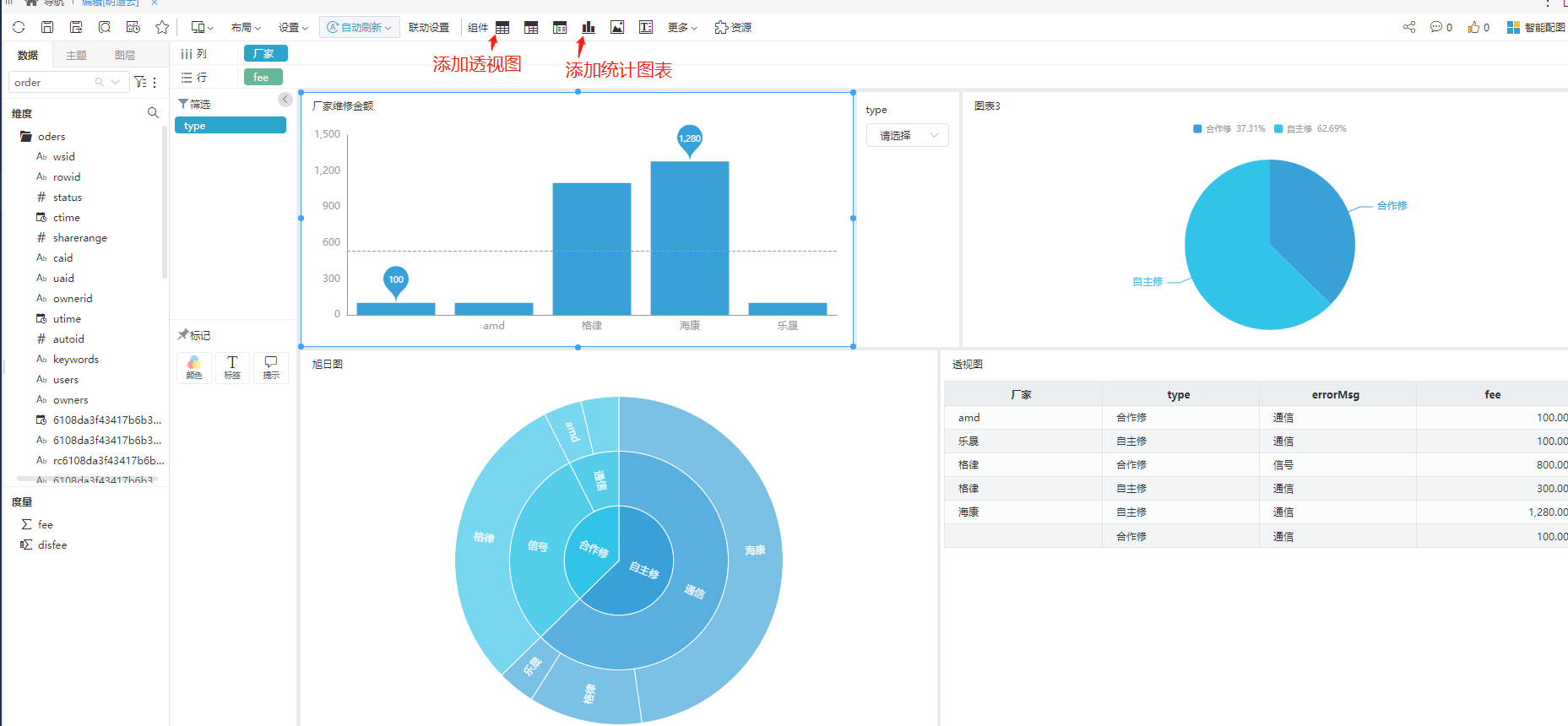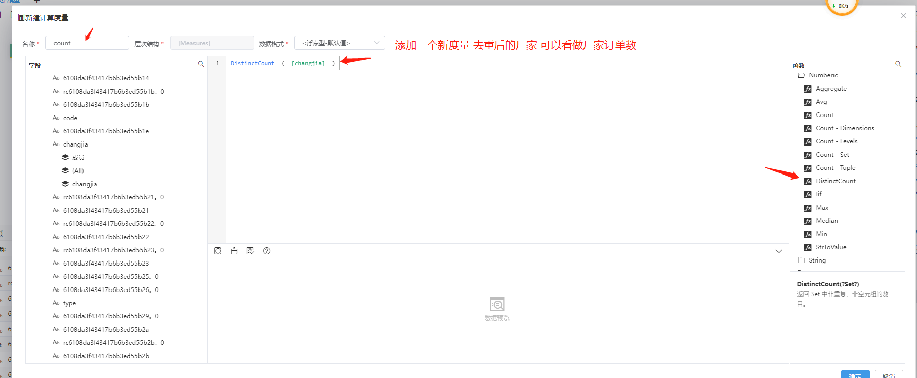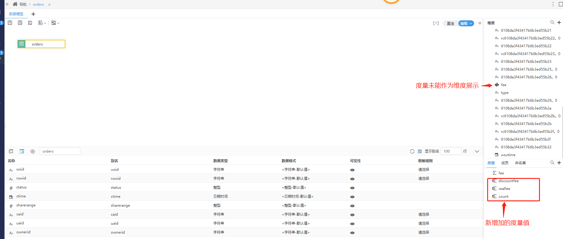设置模型 ,区分出度量,以及添加度量或者维度。度量为数值类型。