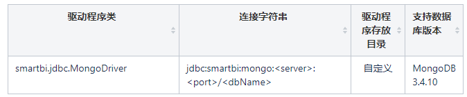 | 驱动程序类型 | 用户选择连接的数据库的类型。目前支持的数据库为 MongoDB,其驱动程序类为:Smartbi JDBC for MongoDB。 |