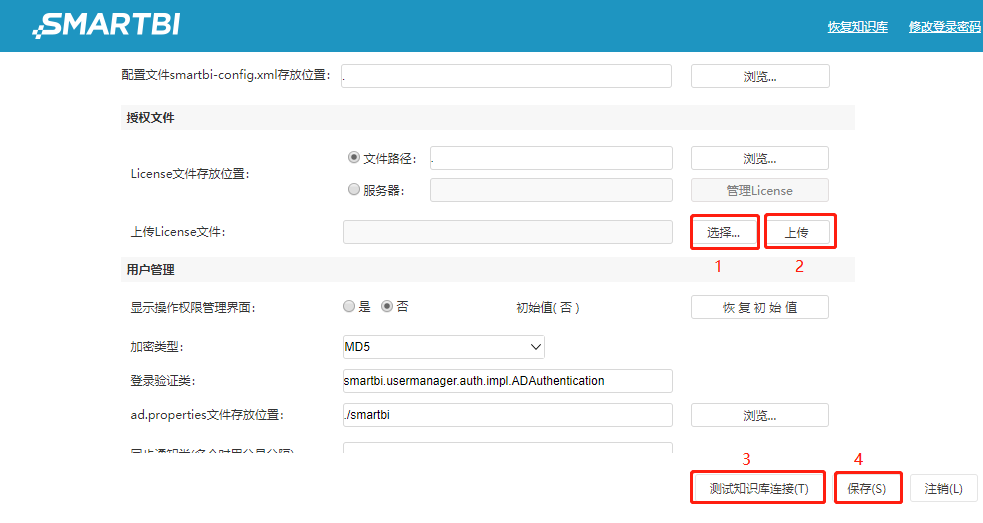 点击配置 license 或点击 SmartBI 系统环境配置 license,点击选择,选择 License,点击上传,上传成功后,点击测试知识库连接,提示连接成后,点击保存。