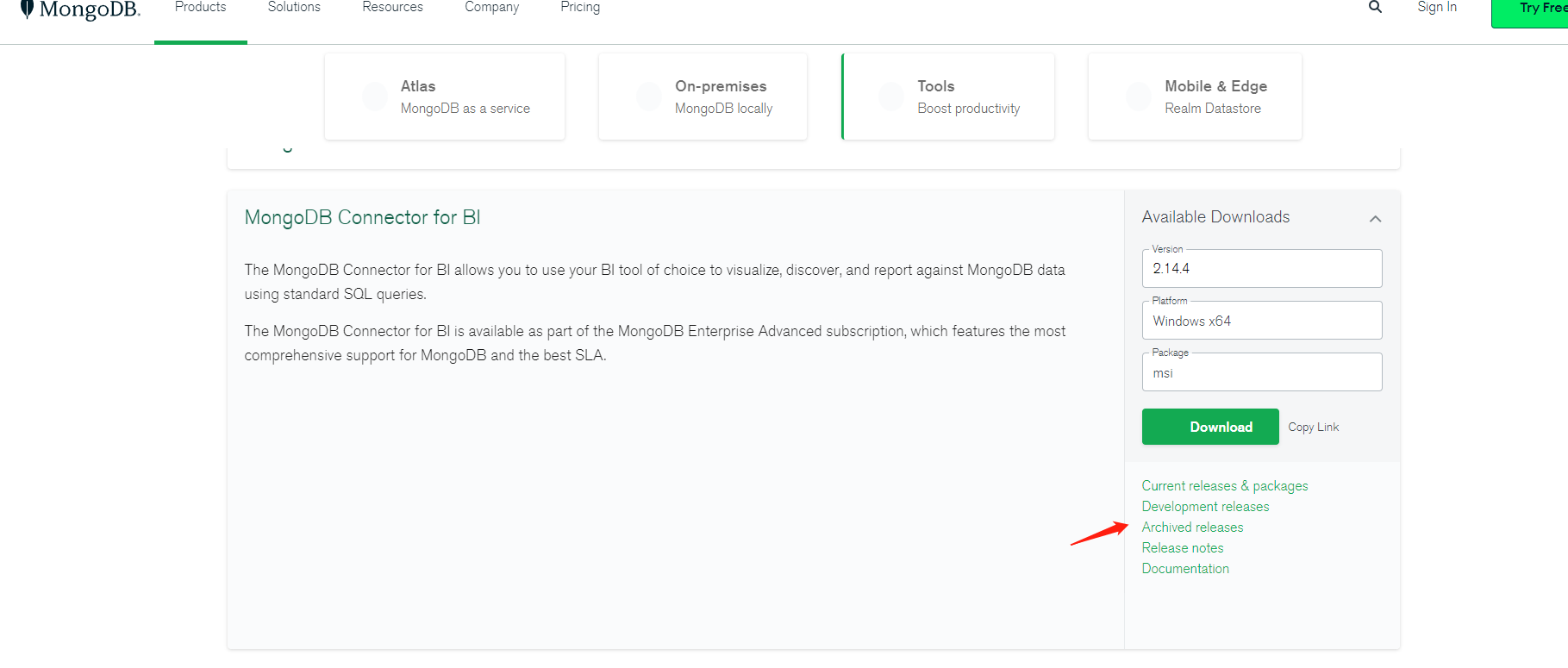 打开此链接跳转至 Mongodb Connector for BI 下载界面。