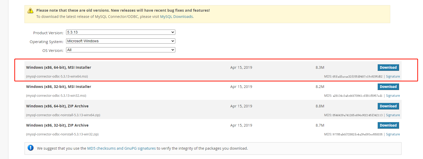 [打开此链接跳转至MySQL odbc下载界面。](https://dev.mysql.com/downloads/connector/odbc)