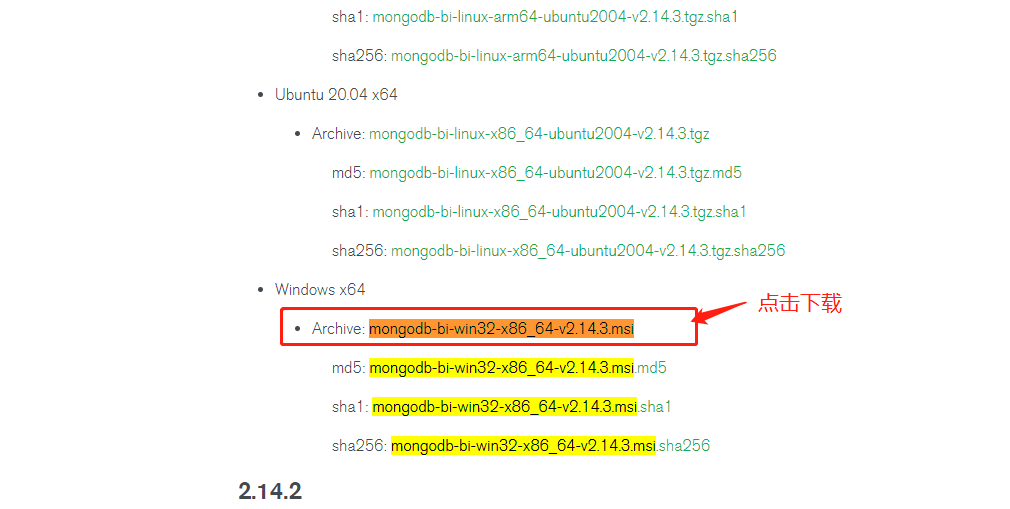 点击归档版本,因为 2.14.4 移除了对 mongo 3.4 3.6 的支持找到 v2.14.3.msi 版本, 或直接点解下载 mongodb-bi-win32-x86_64-v2.14.3.msi