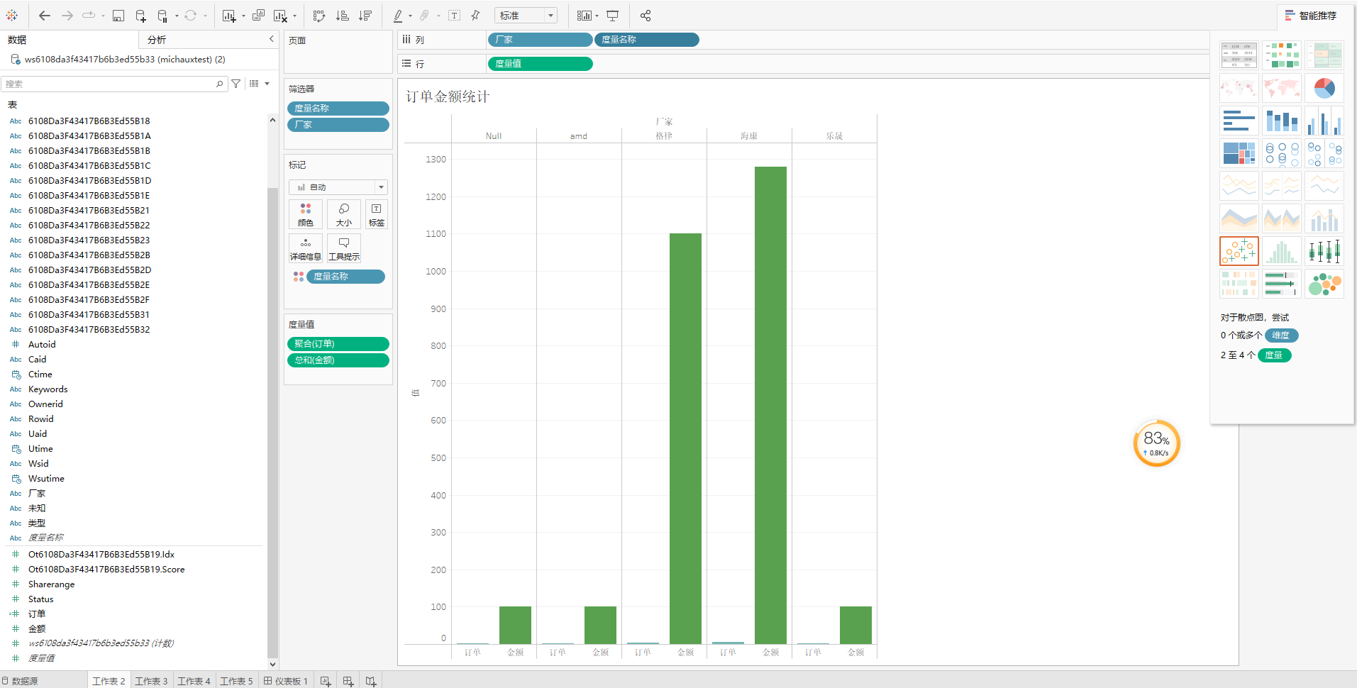 点击加载,工作表加载完成后点击,右侧出现刚才我们选中的表根据明道表字段对照点击查询明道应用工作表 API 获取方法 ,配置不同的视图报表或者数据报表,设计完成后发布使用即可。最后出一个示例图效果如下。
