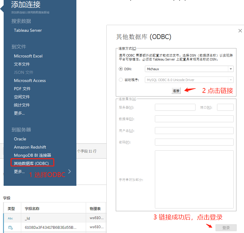 打开 Tableau,选择数据源,如果需要连接至 DSN 需要连接至 ODBC