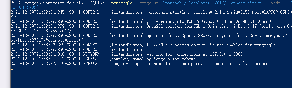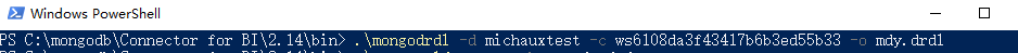 使用 mongosqld.exe 开启 MongoDB Connector for BI, 在终端中执行命令