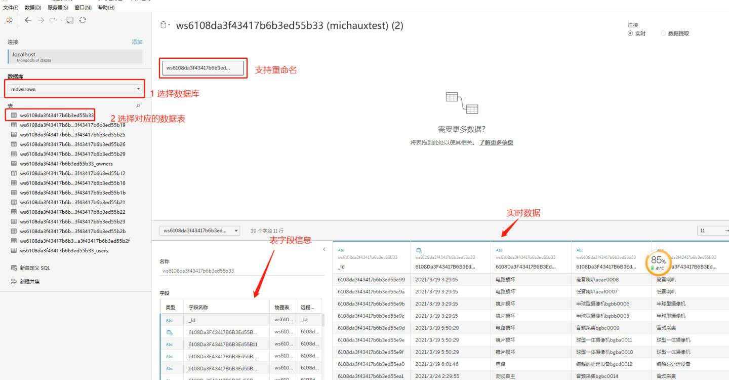 明道工作表记录信息存储在"mdwsrows"中,选中这边库,然后在选择自己需要统计的工作表。