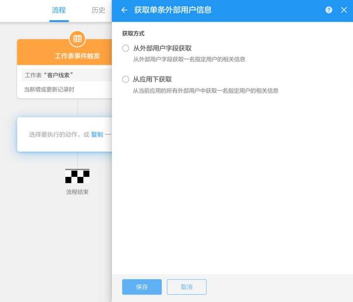 在节点菜单栏里,新增“获取单条外部用户信息”和“获取多条外部用户信息”节点。你可以通过外部用户字段或应用的方式,获取外部用户信息。