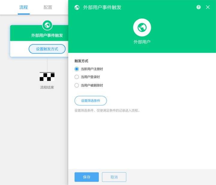 你可以设置当新外部用户注册、当外部用户登录,或者当外部用户被删除时,触发工作流。