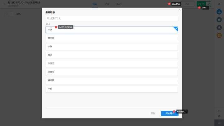 你可以直接在工作流界面选取一条数据来触发流程,测试效果。注意,如果你的流程触发条件是删除记录,选择测试的记录并不会把记录真的删除。