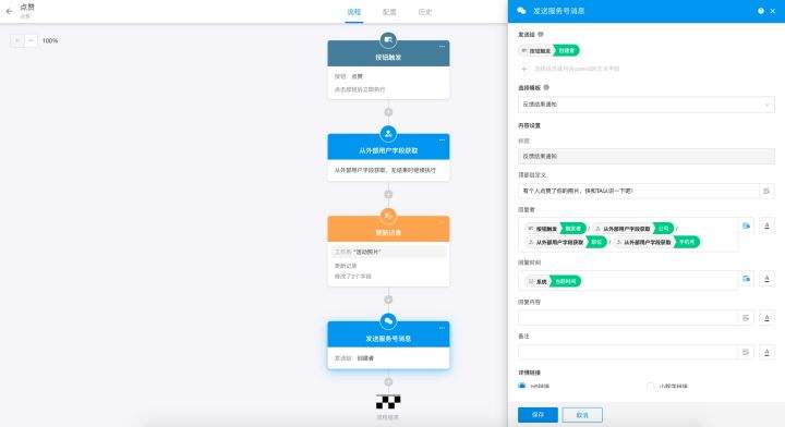 在开始配置消息节点前,必须先在组织后台绑定企业微信服务号,并在服务号后台开通你所需要的模板消息。然后,你就可以在这个节点里选择所需的模板消息,配置相应的字段。