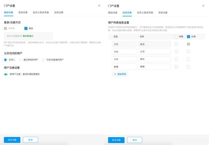 在应用的用户功能界面启用外部门户后,点击“门户设置”,对登录/注册方式、访问用户权限、注册用户信息收集、登陆界面、消息设置等进行自定义设置。注意一点,如果你希望通过微信服务号为外部用户发送消息,那么你需要先在组织后台绑定企业服务号,才能在应用里激活这个功能。