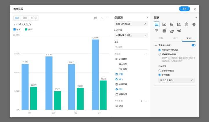 某些统计图的数据来源记录里包含保密性高的信息,管理员可以在统计图里设置“查看统计数据”时界面显示的字段。这样,所有用户都可以在清晰了解数据的同时,避免关键信息泄露了。
