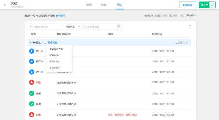 针对一些流程报错、工作流扎堆排队等特殊情况,你可以将其中止、暂停一定时间,以及刷新重试。