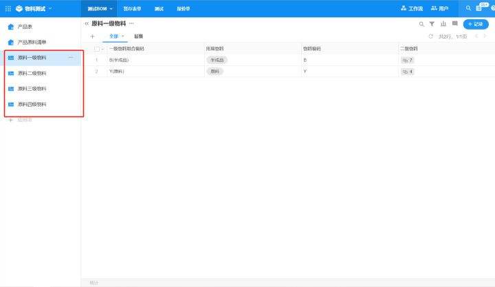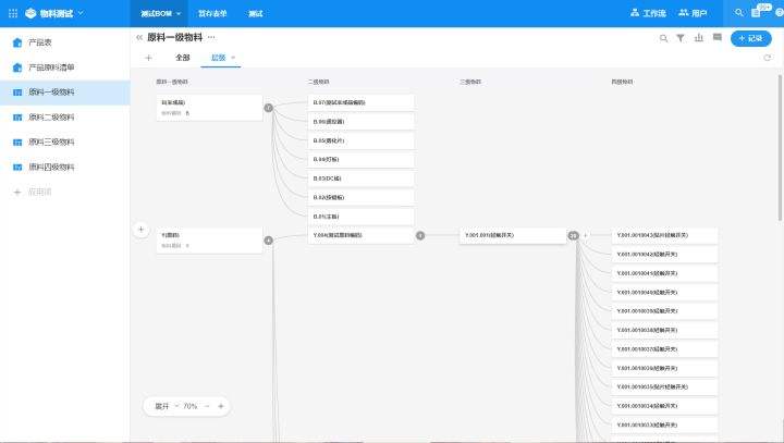 下一步是对层级之间的数据做关联,高一级与下级之间都为一对多的关系。当我们建立好数据后,我们可以用层级视图来清晰地展示物料详细信息和层级关系。