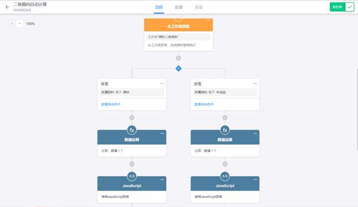 还记得前文提到,物料有“原料”和“半成品”之分吗?不同类型的物料有不同的运算规则。因此,我们在第二步找到记录之后,要做物料分类的分支判断,不同的物料类型运行不同的运算节点。
