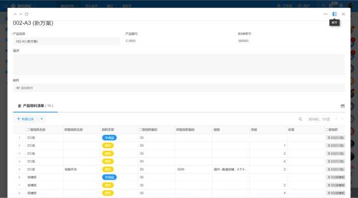 除了产品表单以外,我们还需要有一张产品物料清单,以此来罗列每个产品对应需要的半成品以及原料。这样以便物料自动汇总和排序,并且方便制作更简洁的 BOM 打印模板。 每个产品记录将关联其对应的产品物料清单,效果如下图:
