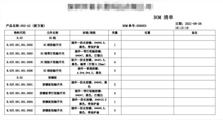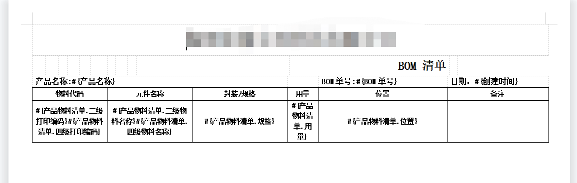 不少客户都要把 BOM 表单打印出来,以便在生产车间核对。而我们搭建出来的 BOM 清单最终的打印模版配置和效果如下图所示。以下效果图和最初对照搭建的 BOM 表单十分相似。