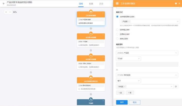 物料清单更新或者新增时触发,同时限定条件产品表及触发的物料类型为半成品(限定触发类型是因为本条工作流最终的效果是需要新增类型为原料的明细,如果流程中不限定类型的话,工作流就会反复被触发)。