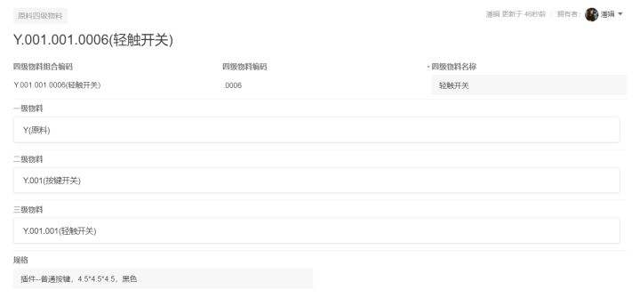 接下来,我们会遇到一个较难的问题——物料元件编码。我们假设每个分类下的物料编码起始值都为 001,四级元件的编码则是 0001,而且每个物料的显示需要组合上级编码及本级的物料名称。