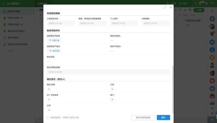 员工可以通过提交风险辨识清单,管控项目工程中的风险内容。通过这部分风险内容,结合关联的可能性 L 和严重性 S,给到风险进行分数评估。而后,系统会自动评判剩余风险。系统根据不同取值得分,将风险分发至不同的流程分支,再交由相关人员进行管理。
