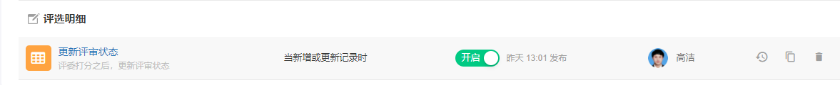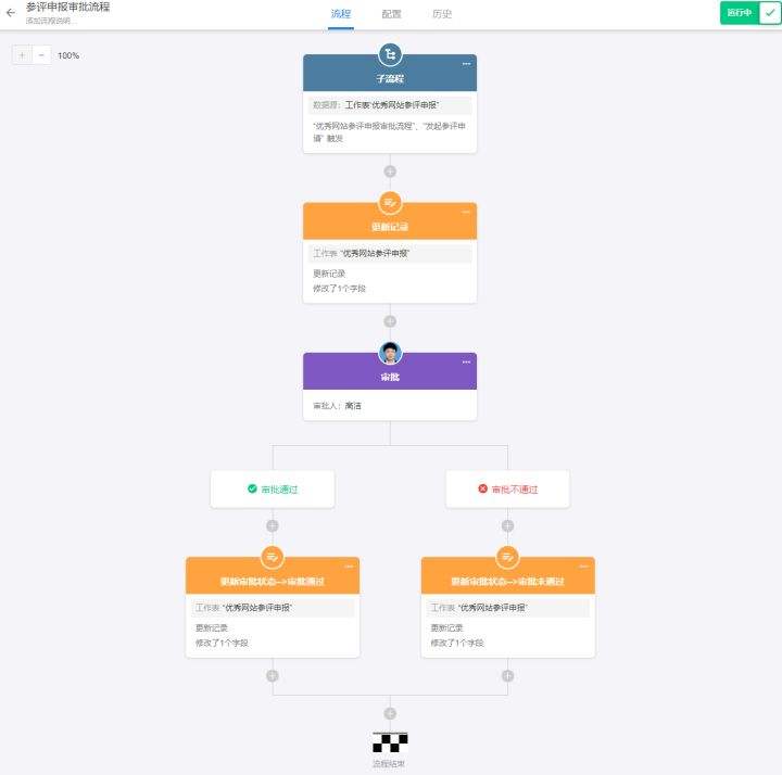 - 当“优秀网站评选参评申报表”新增时触发此流程。流程发起后,首先将流程的审批状态更新为“审批中”,这样方便申报人随时查看流程状态。