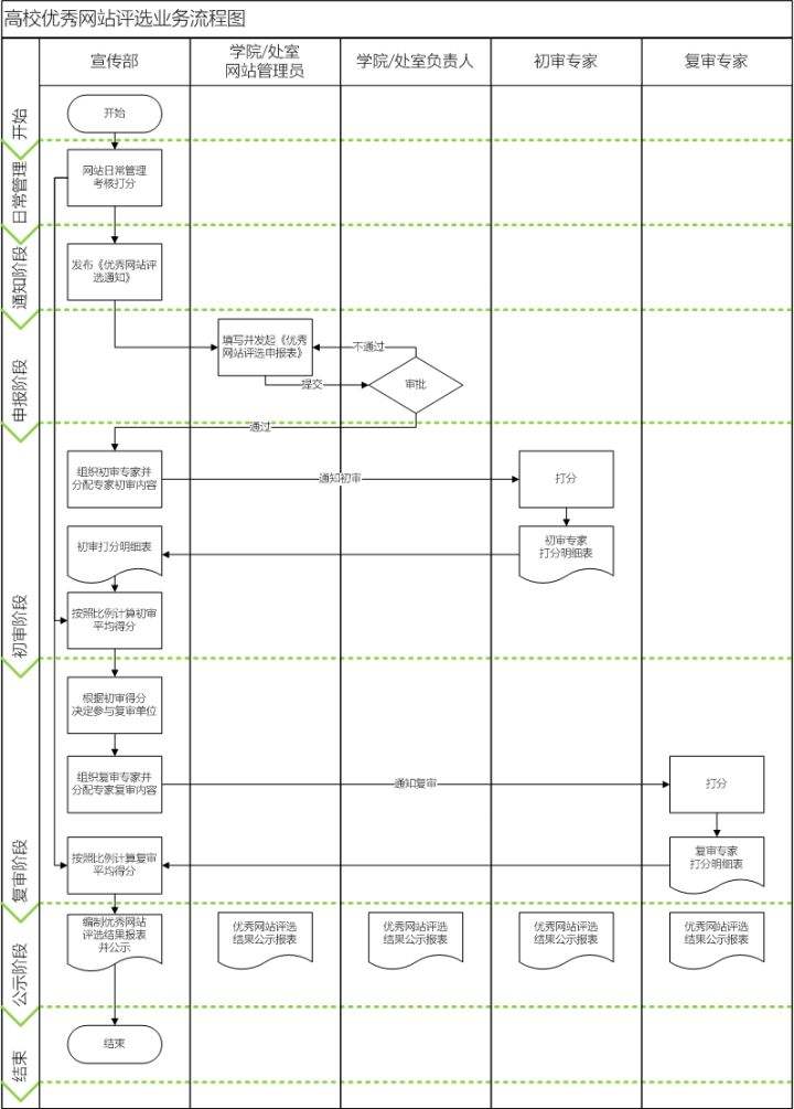 根据如上流程图,我们可以看出“高校优秀网站评选业务流程”包含宣传部、学院/处室网站管理员、学院/处室负责人、初审专家和复审专家 5 个角色。