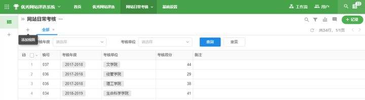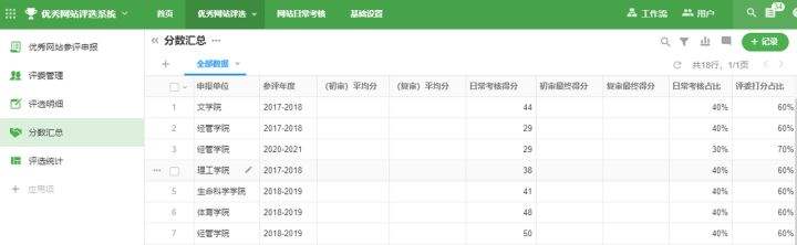 该配置页主要是针对各学院/处室日常进行的网站维护情况进行打分,每学年打一次分。