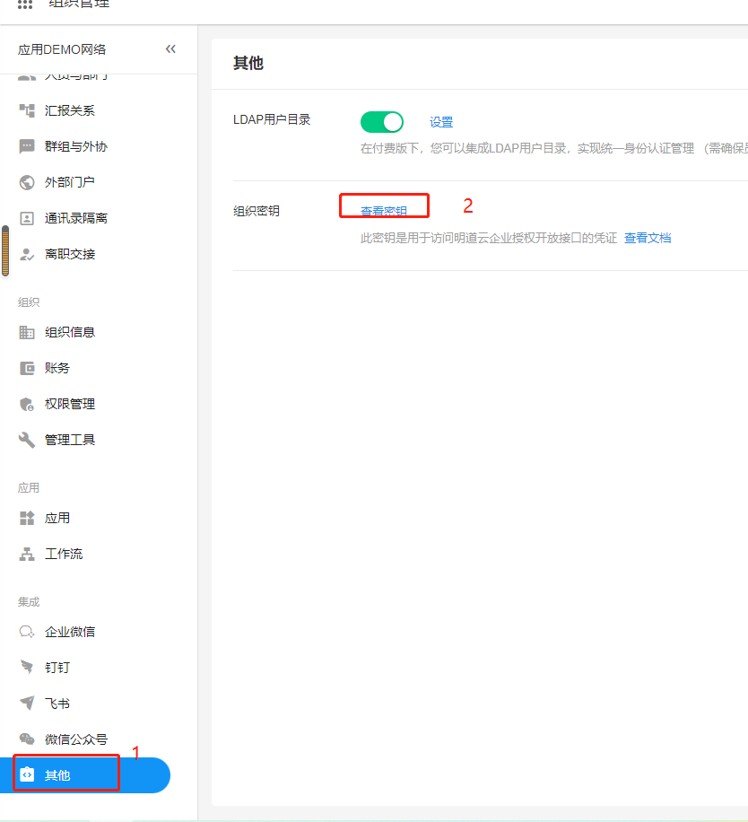 进入明道云系统 - 组织管理 - 其他 - 组织密钥,获取企业授权开放接口密钥。