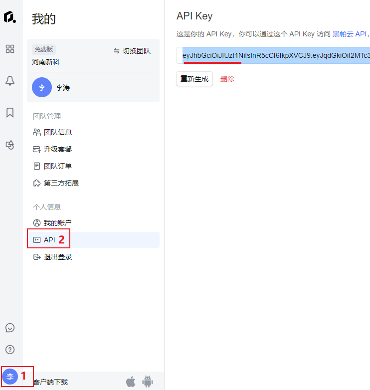 参考下图操作,进入「我的」-「API」,获得 API Key。