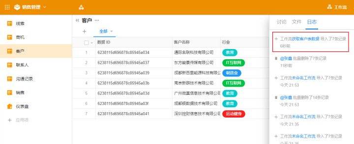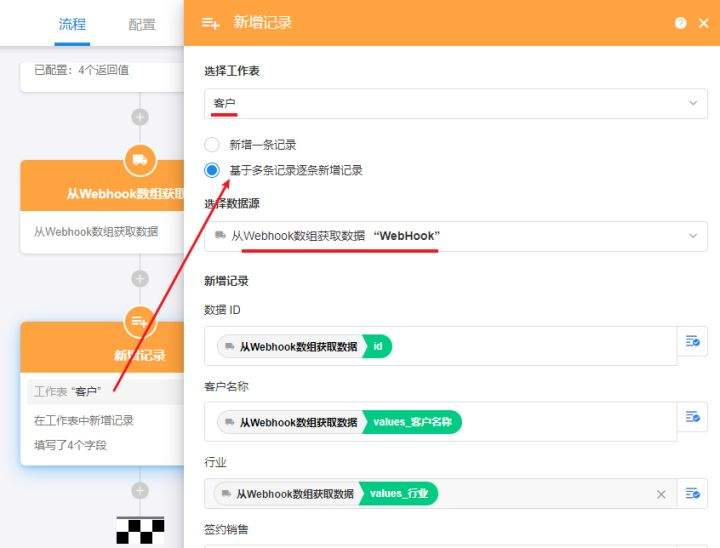 通过新增节点,批量将客户数据新增到客户表中。在把获取的表数据写入对应字段的同时,记得把数据 ID 也写入工作表。