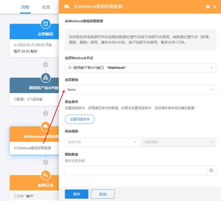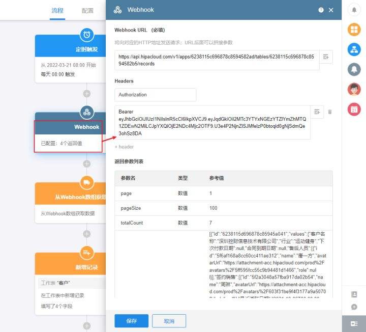 流程触发后,通过 Webhook 节点,调用「客户」表 API 接口,获取数据。