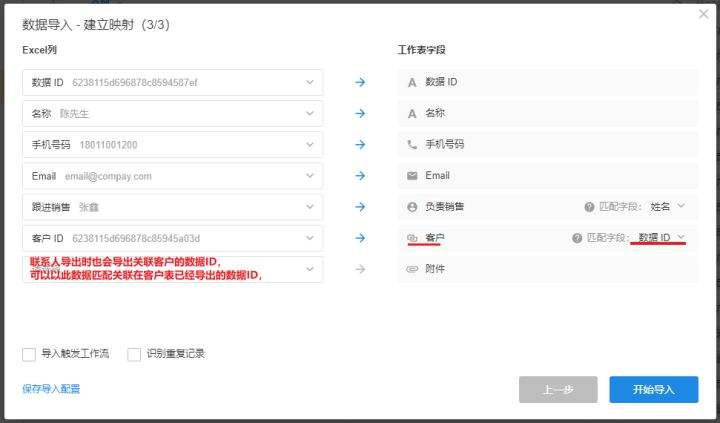 「联系人」和「客户」表有关联关系,如果要在导入联系人时就自动关联客户数据,则要在导入联系人时,根据联系人 Excel 表的客户 ID,去客户表中根据数据 ID 字段查询数据。如果系统能找到对应的数据,就能自动关联。建立字段映射时注意下图的选择。