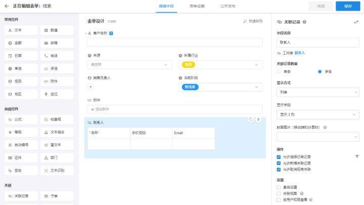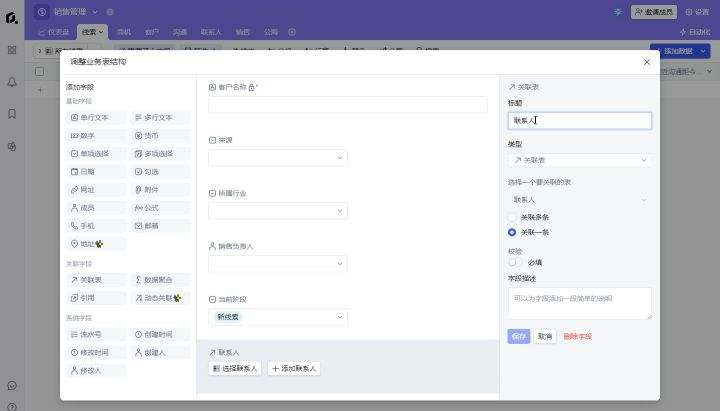 以「销售管理」应用中「客户」和「联系人」两张表为例,它们之间有一对多的关联关系,即:一家客户可以关联多个联系人,1 个联系人只能归属于 1 家客户。