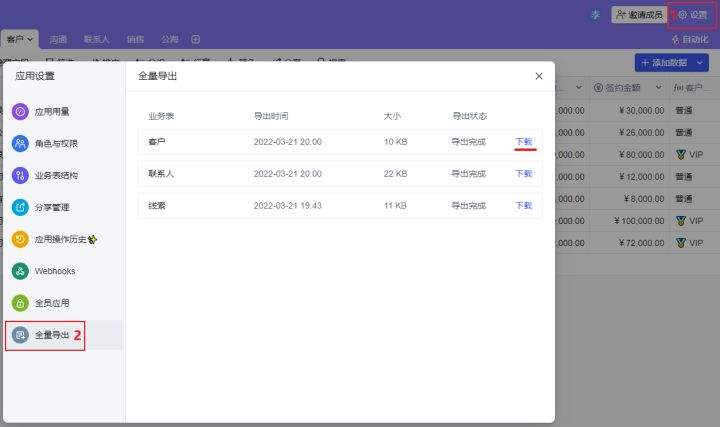 全量导出数据的下载界面 b.在明道云中导入业务数据