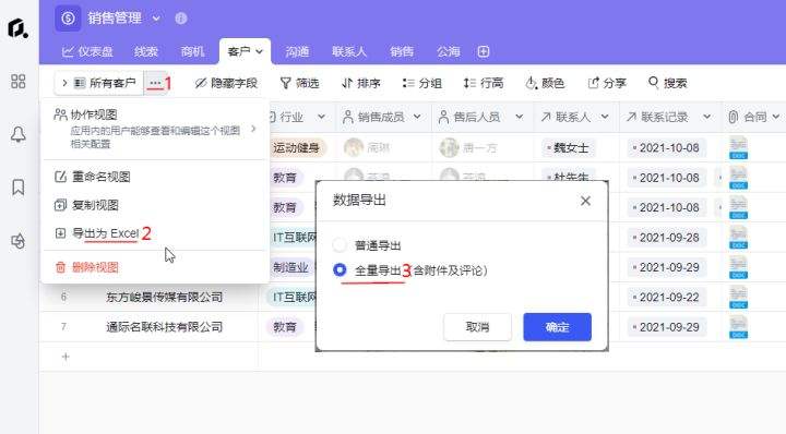 选择能够显示全部数据的视图(不要隐藏字段或设置筛选条件),然后全量导出为 Excel。分别导出客户数据和联系人数据。
