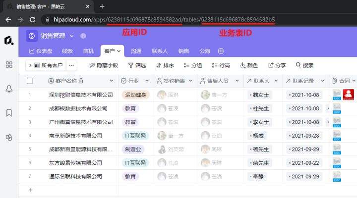 虽然所有业务表的 ID 不同,但获取方式相同。在黑帕云的每个应用的每个业务表界面里,你可以从网址链接中获得相应的应用 ID 和业务表 ID,参考下图