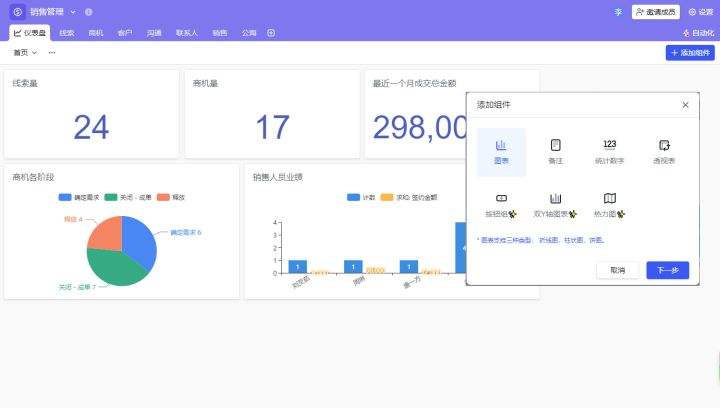 统计图是帮助管理者科学决策必不可少的功能。黑帕云目前提供的统计图型和组件能力较少,明道云都能覆盖,并提供更多灵活功能。