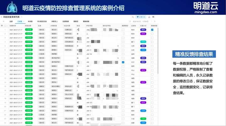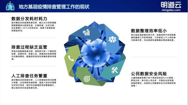 自 2020 年以来,全国多地疫情零星爆发,疫情防控排查成为政府基层工作的重中之重。面对疫情多变的特点,大部分各级政府采用 Excel+ 人工的方式完成数据收集、整理、分发、上报、台账整理的工作。同时大量的公民数据在微信群里流通,所有排查动作没有记录,都会造成公民数据泄露、排查过程无法监管等问题。