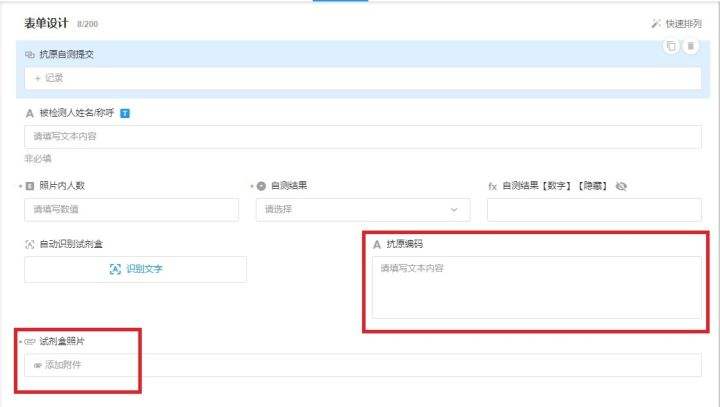首先,构建抗原自测结果提交表单。本功能主要涉及的是“抗原检测结果”中“试剂盒照片”字段和新增的“抗原编码”字段。详见下图。