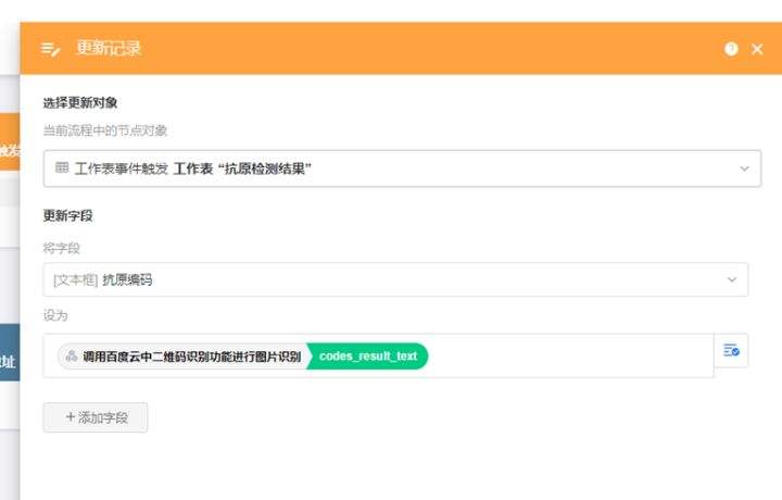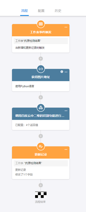 通过明道云工作流配置,让系统自动识别图片二维码,并更新入抗原编码。整个配置过程主要使用了工作表事件触发、代码块(python)、Webhook、记录更新等动作。详见下图。