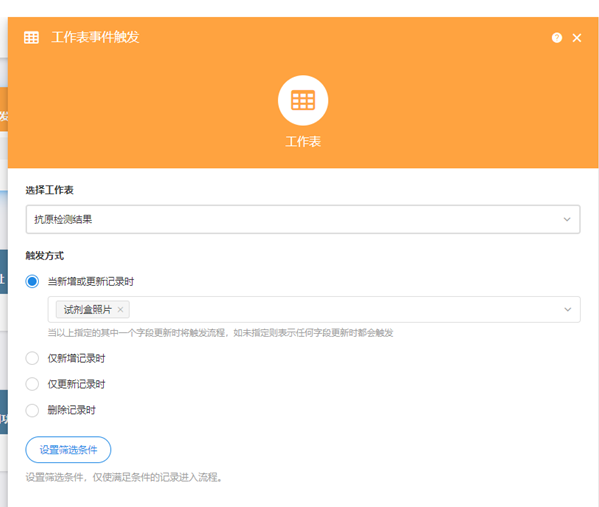 第一步:设置触发条件。对本次功能而言,就是当居民在表单中上传或更新抗原图片后,开始执行工作流。