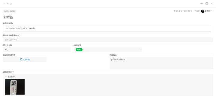 手机端完成抗原图片上传并同步后,后台自动识别抗原试剂盒上二维码代表的抗原编码并填入抗原编码字段中。