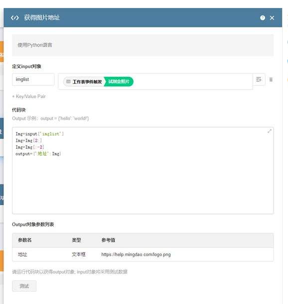 将表单中“试剂盒照片”作为输入传入 python 代码块中,并提取出其中有效的图片地址。此处使用了笨办法,就是将读取到地址的首尾各两个字符去除,中间即为单张图片的地址。如有多张图片,可参阅明道云帮助信息中对多张图片 url 地址读取的处理方式,此处不再赘述。