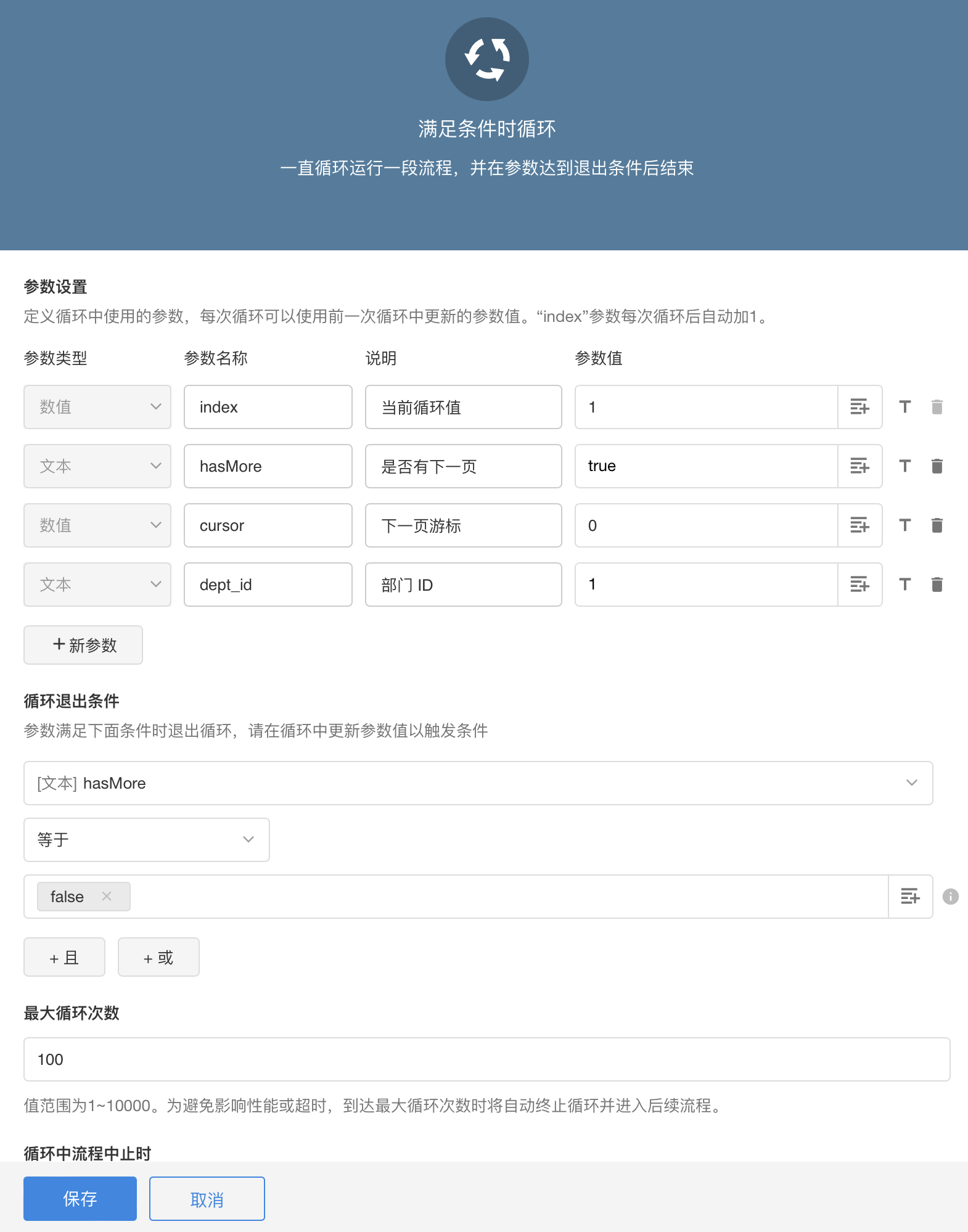 如果对应结果满足循环条件则调用下一次循环 webHook 发送节点 发送 urlAA;如果不满足 则跳出。