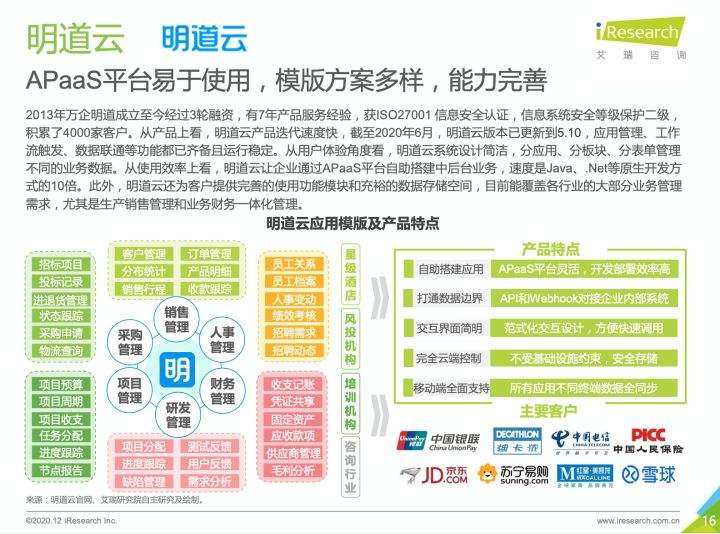 2021 年 1 月 14 日,艾瑞咨询发布了《2020 年中国 APaaS 应用及选型白皮书》,明道云被艾瑞研究院作为标杆产品进行了研究和分析。这是国内第一份 APaaS 行业的选型分析报告,如果您希望对 APaaS 有全面的认识,此份报告一定会提供不少帮助。