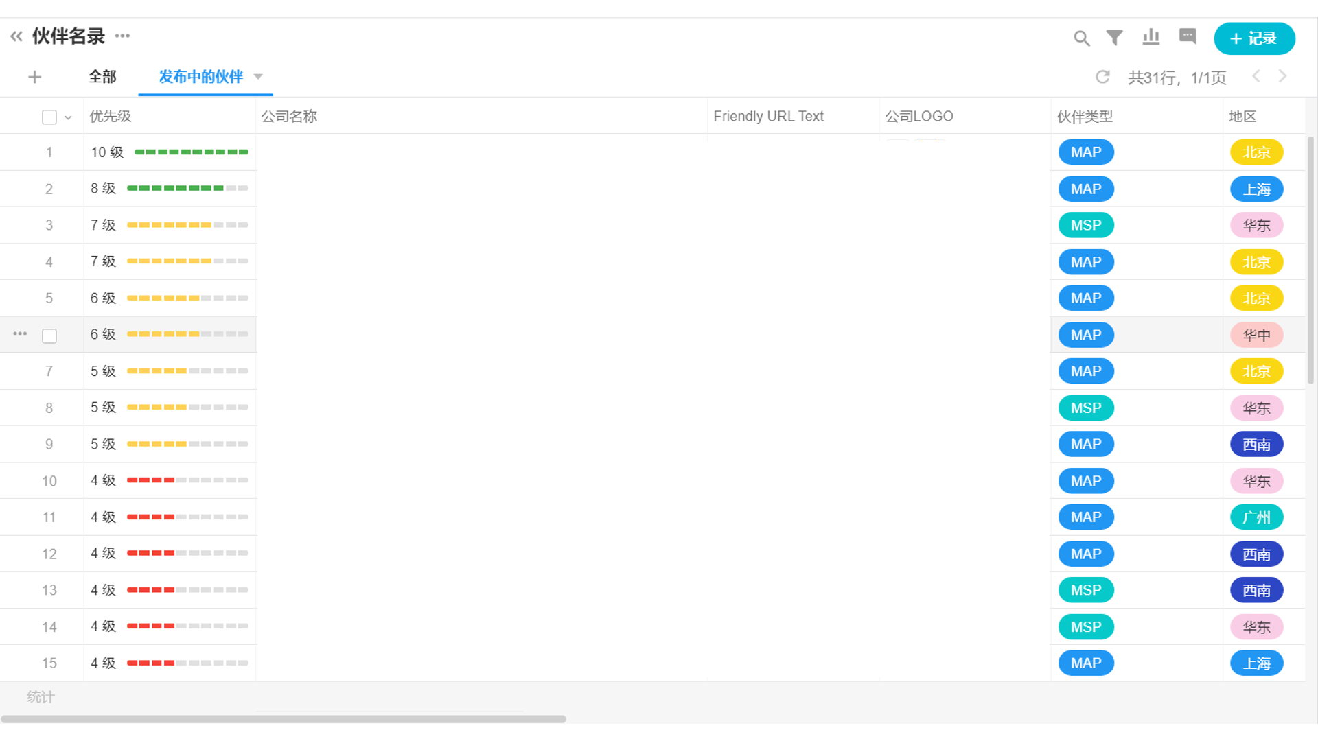 视图:对于每个工作表,我们都设置了“全部”和“发布中”两个视图,让网页服务器获取“发布中”视图中的信息。由此,网页管理员在维护数据时,可以在自由控制数据前端显隐、展示优先次序的同时,保留当前暂不需要上架的数据,保证数据管理的完整性。
