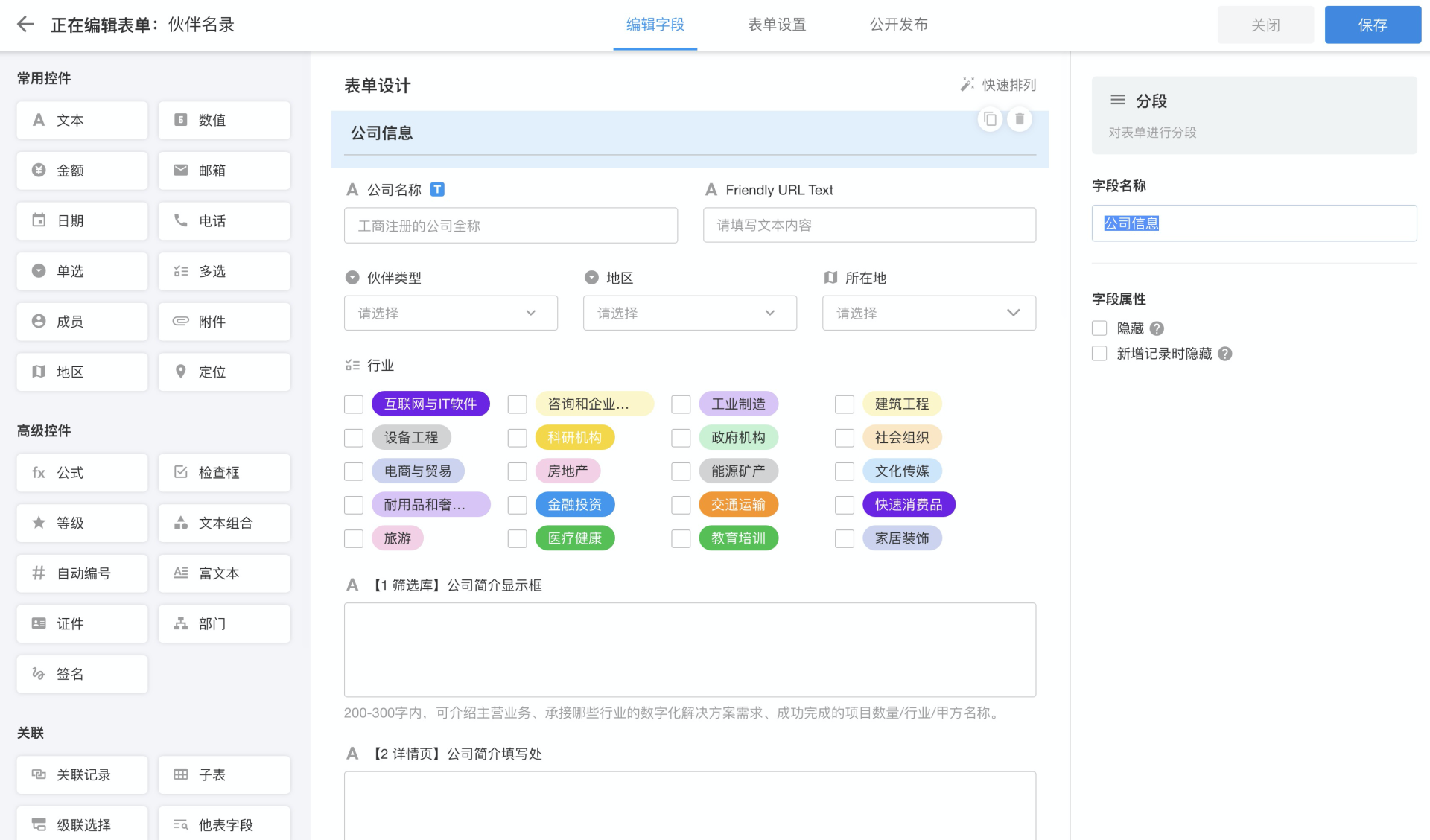 **表单:**我们只需根据前端需要的信息,配置相应的字段。值得一提的是,为了让“官网后台数据管理”应用与数据关联应用的信息保持一致,便于维护,我们使用新功能“选项集”来维护行业、场景、所在地字段。管理员只需在选项集界面编辑选项,所有动用到该选项集的工作表对应字段都会同步更新选项。比使用关联表来统一维护信息的好处是,网页服务器在获取数据库信息时运行速度更快,给访客带来更优的交互体验。