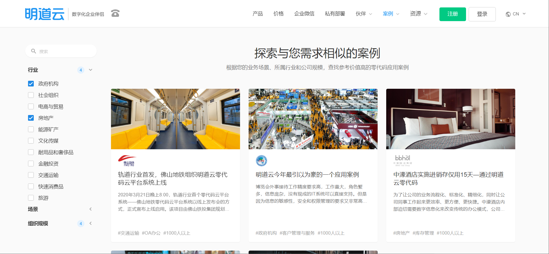 一方面,我们需要将成功的客户经验案例整合发布,让考虑用 APaaS 搭建企业管理系统的企业管理者有更清晰、丰富的参考信息,增强采用明道云产品的信心。另一方面,明道云伙伴兼备零代码应用搭建技能和垂直行业管理经验,是提供各行业中数字化管理方案的最佳人选,因此我们应大力支持其拓业,在前端营销宣传上给予更多资源。因此,今年 9 月份,明道云市场部正式启动官网案例库和伙伴页开发的项目。