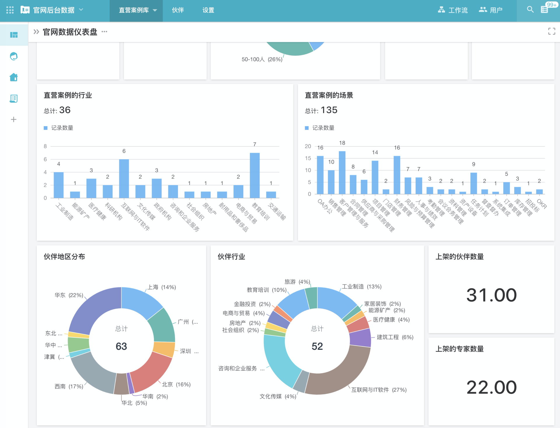 要知道,案例库和伙伴名录的信息是在销售环节中,销售顾问成交客户和签约伙伴时产出的信息。因此,“官网后台数据管理”需要与销售和伙伴管理应用的数据互联互通——以销售顾问成交订单、签下伙伴的动作为触发点,让系统自动生成案例库或伙伴记录,再交由顾问或伙伴完善信息后上架。