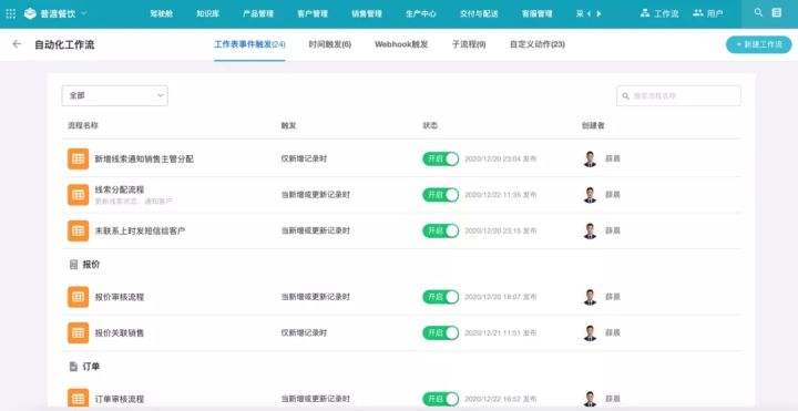 在明道云应用平台中,工作流是由触发器和一系列动作节点构成的。只要触发器满足条件,就会自动执行所有的动作节点。在本案例中,有诸多环节均需要由特定角色触发工作流程,例如生成加工单。这个工作流可以通过一个按钮触发,然后通过数据操作相关的节点,将订单中的数据转移到加工单上。下图是整个系统所配置的工作流。